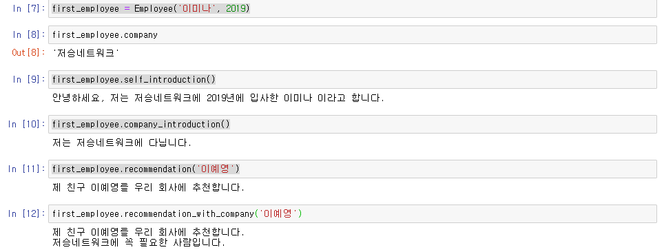 print(f'안녕하세요, 저는 {self.company}에 {self.enter_year}년에 입사한 {self.name} 이라고 합니다.')